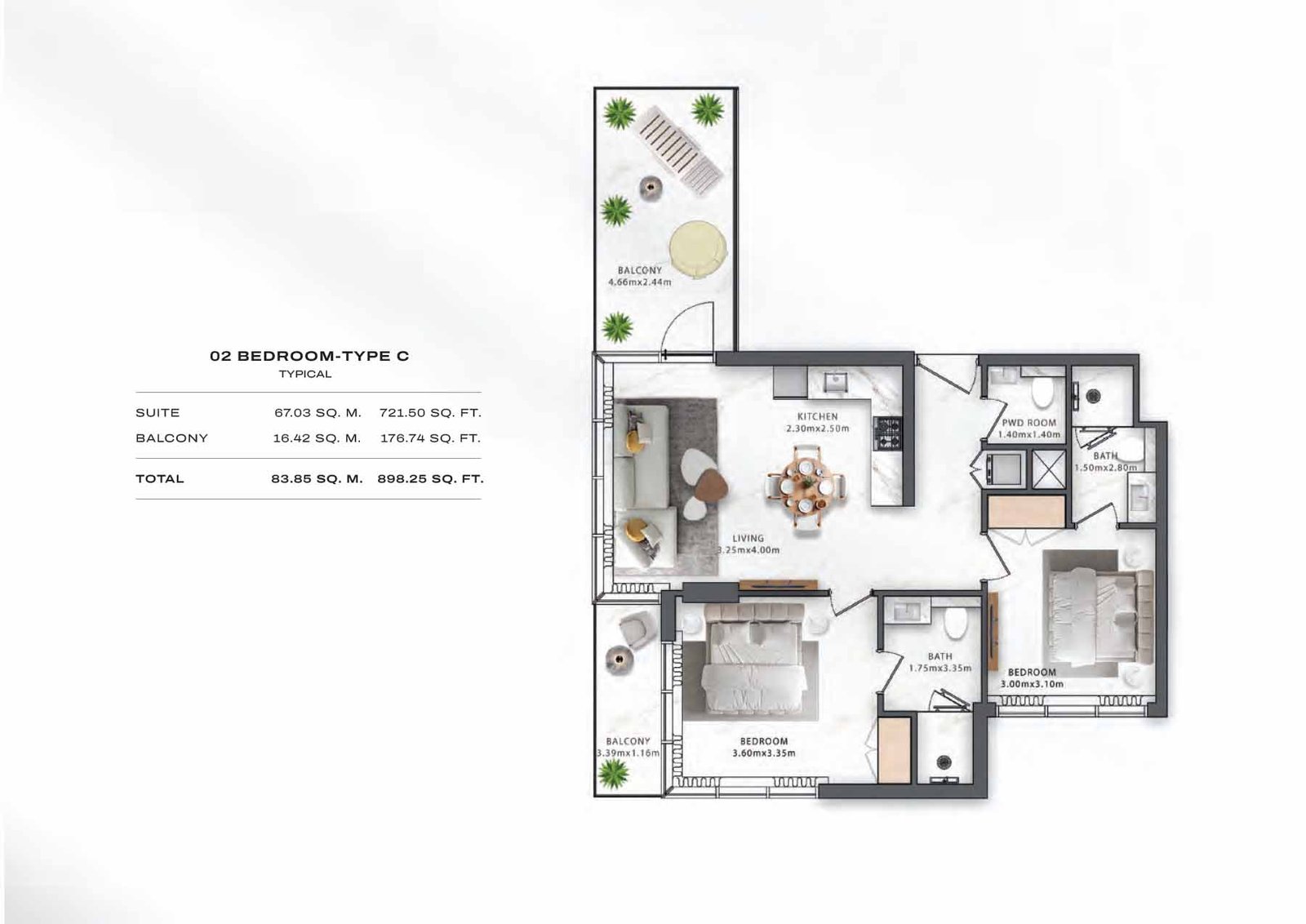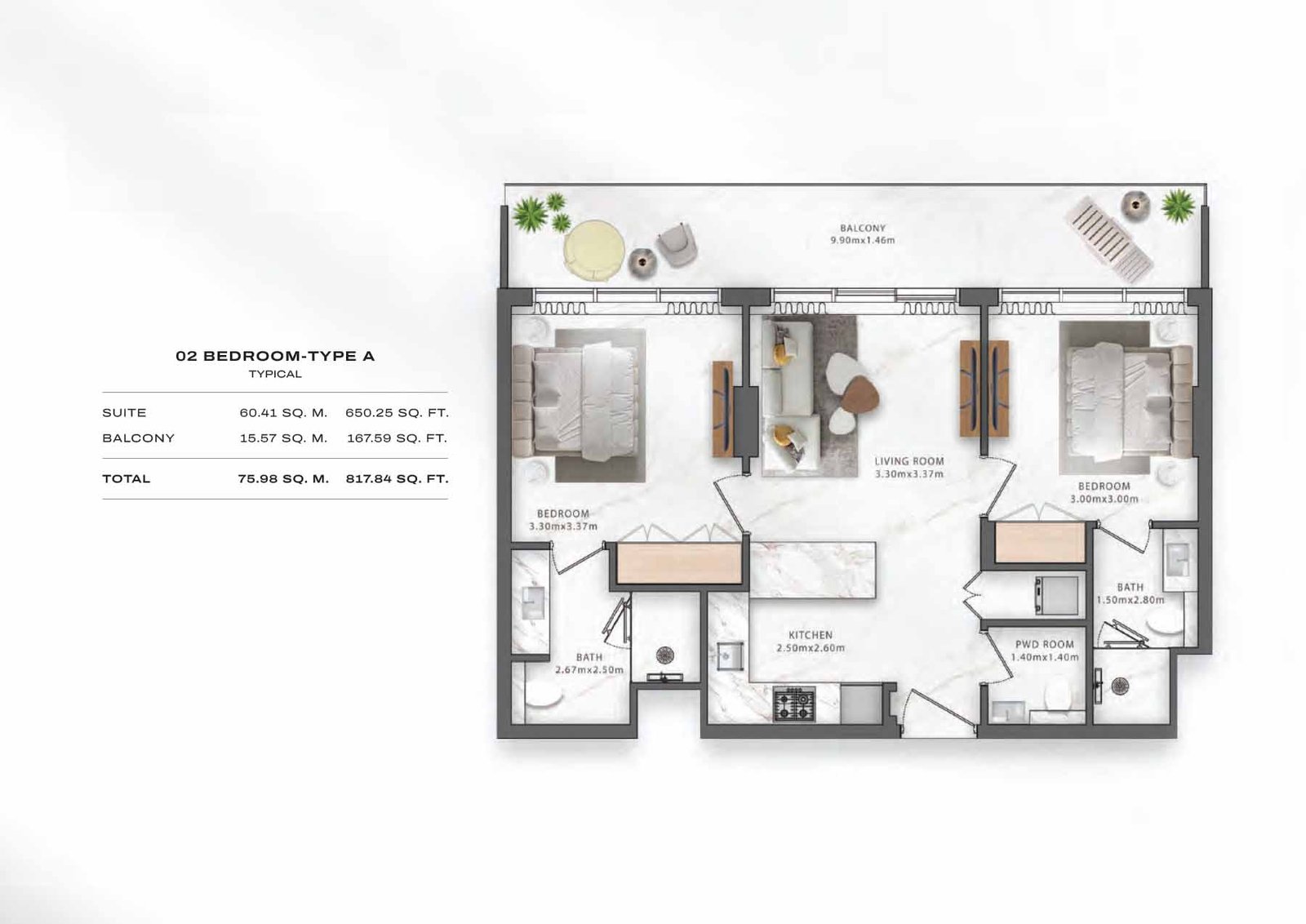 Elegant two-bedroom apartment featuring spacious living areas, generous balcony space, and a refined layout tailored for relaxed family living.